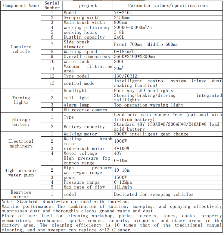 Kullanım yeri: Atölye, park, sokak, cadde, rıhtım, mülk toplulukları, depolar, spor salonları, okullar, havaalanları ve fabrika alanındaki diğer alanların temizliğinde kullanılır. Temizleme verimliliği, geleneksel manuel temizliğin 10 katıdır ve bir süpürücü, 8-12 Temizleyicinin yerini alabilir.