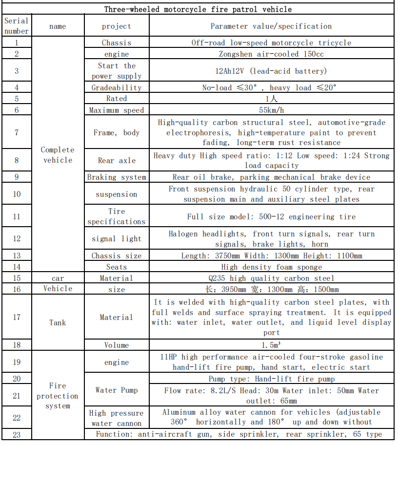 Kırsal yolların düşük eğimi ve itfaiye istasyonlarına olan mesafenin uzun olması nedeniyle, üç tekerlekli itfaiye motosikletleri ilçedeki profesyonel itfaiye ekiplerinin ana ekipmanı olarak kullanılabilir. İki tekerlekli araçlara göre daha fazla malzeme taşıyabilirler ve dört tekerlekli itfaiye araçlarına göre karmaşık yol koşullarına daha kolay uyum sağlarlar ve "yakındaki polis sevkini ve hızlı imhayı" gerçekleştirirler.